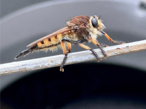 As the investigation continued, Kayla – a fellow member of STEMComm VIP team, introduced me to Google Lens. Surprisingly, it gave me a solid answer right away – Robber fly. To be more exact, the guest belongs to the species Promachus rufipes (red-footed cannibalfly).