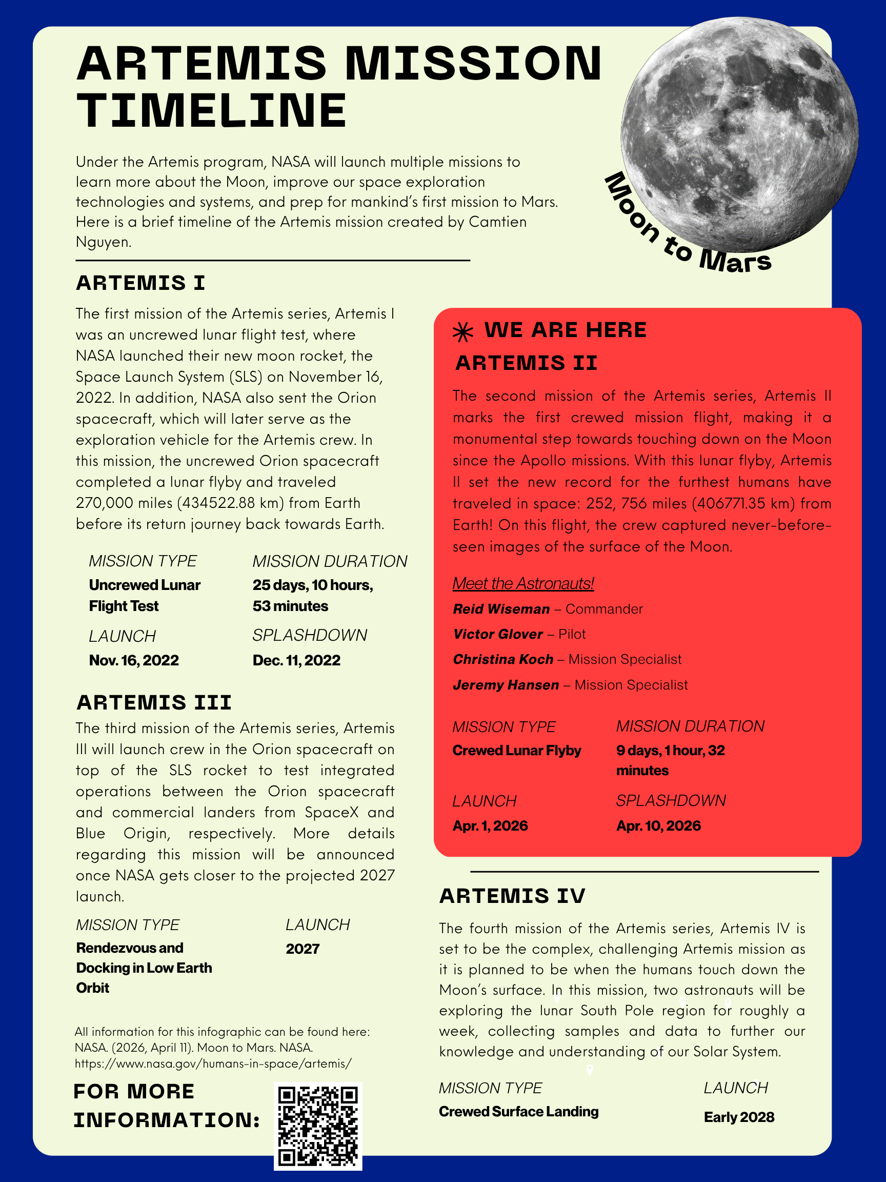 I attached an infographic that I made for the Artemis mission. All the information on this infographic can be found on NASA’s website!